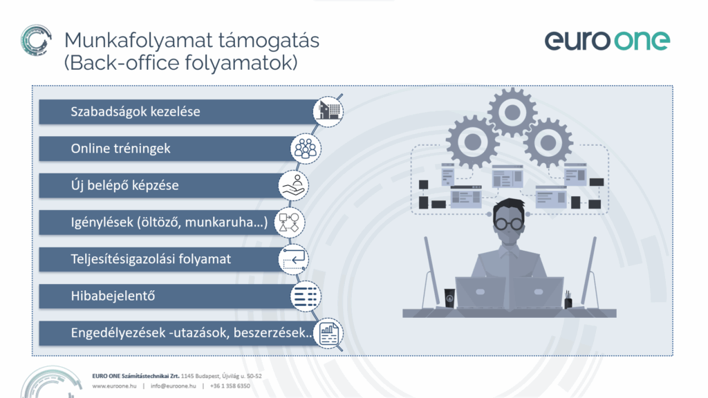 Szabadságigénylések, képzésszervezés, szerződéskötés, hibabejelentés vagy teljesítési igazolás folyamatának támogatása– mindezek automatizálhatók, egyszerűsíthetők, és beépíthetők a mindennapi működésbe.